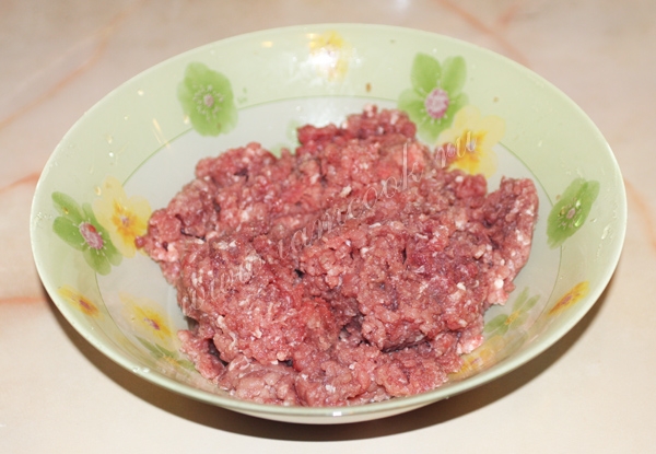 Прокрутить говядину и свинину в равных пропорциях на мясорубке.