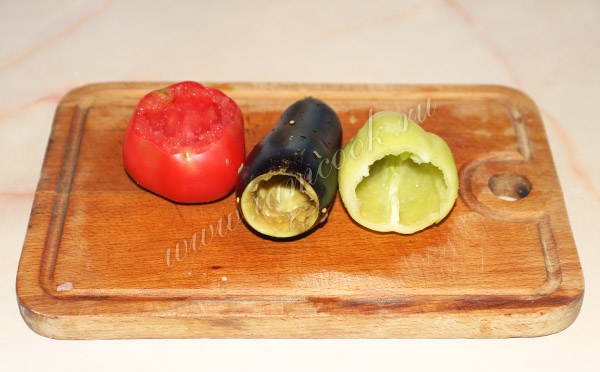 Подготовить овощи. У перца отрезать верхушку, извлечь семена. У помидора срезать попку и при помощи чайной ложки извлечь мякоть. Баклажаны у меня были специально подобранные на рынке, маленькие. Из них необходимо извлечь сердцевину при помощи небольшого ножа. Мякоть помидора и баклажана нам еще понадобятся, поэтому переложите ее в отдельную глубокую тарелку.