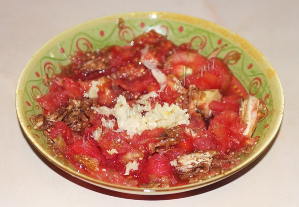 Выдавить 4-5 зубчиков чеснока к извлеченным цердцевинам помидоров и баклажанов.