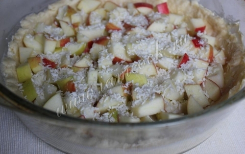 Распределите тесто по смазанной форме и сфомируйте бортики. Лучше использовать разъемную, но я в этот раз готовила в стеклянной диаметром около 22 см. Уложите яблоки и посыпьте их оставшейся половиной кокосовой стружки.