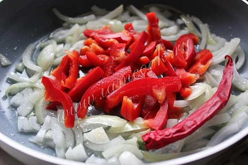 Добавьте нарезанный болгарский перец и нашинкованный или целый, как в моём варианте, чили, поджарьте вместе и потушите.