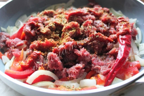 Минут через 5 добавьте фарш, например, из свинины и говядины, все специи, томатную пасту, посолите, обжарьте всё вместе на сильном огне и потушите практически до готовности фарша.