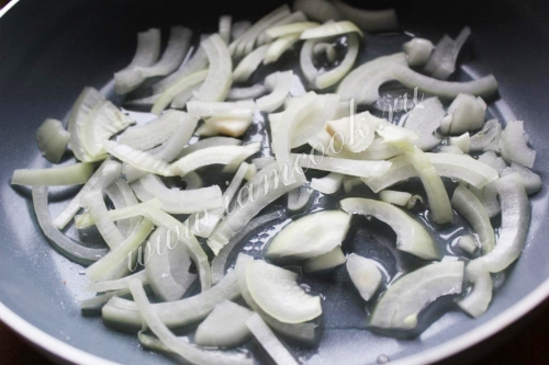 На сковороде с растительным маслом на среднем гне потомите крупно нашинкованный лук.