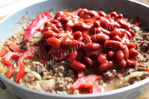 В готовому фаршу добавьте фасоль консервированную в томате.