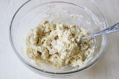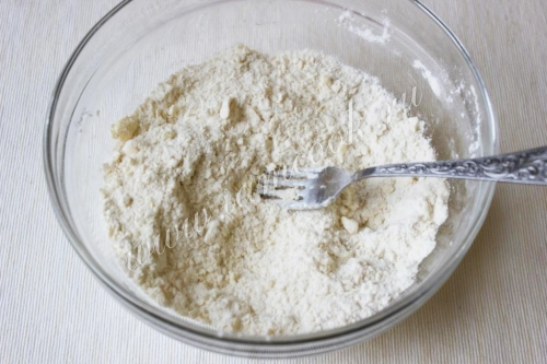 Перемешайте тесто как бы растирая в мелкую крошку, лучше это делать лопаточкой или вилкой, чтобы ингредиенты оставались холодными.