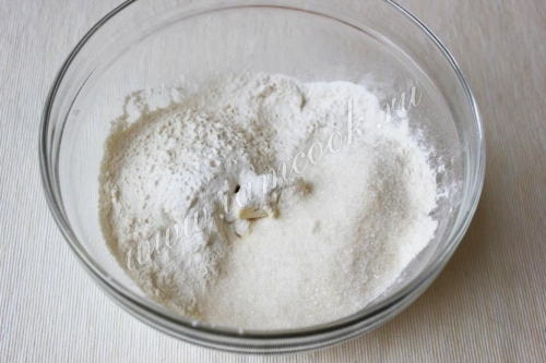 Затем добавьте муку с разрыхлителем и сахар (по вкусу можно добавить ванильный сахар).