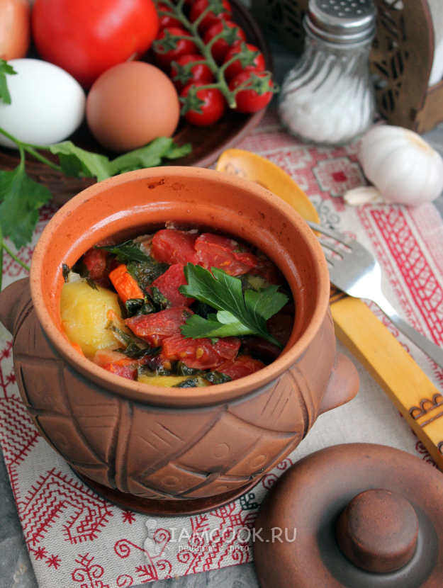Нарежьте помидоры кубиком, порубите свежую зелень и добавьте их сверху в горшочки. По необходимости подлейте горячей воды.