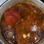 Когда овощи готовы – добавьте в бульон подготовленное сало с чесноком, хорошо все перемешайте, потомите на небольшом огне еще примерно минуту и выключите огонь.