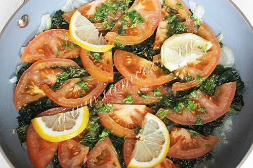 Следом укройте слоем из долек томата, лимона и рубленой петрушки.