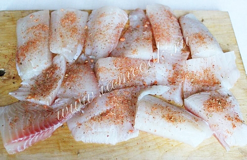 Филе рыбы можно оставить крупными кусками или нарезать на средние, посолить и посыпать специями, пусть помаринуется, пока подготавливаются овощи.