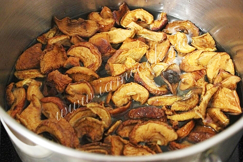 Если яблоки покупные, то обязательно промойте их, а если сушили их сами, то сориентируйтесь сами мыть или не мыть. Минуты три прокипятите воду с сахаром в кастрюле на среднем огне и затем добавьте яблоки.