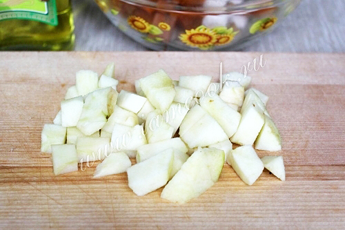 Яблоко тоже нарежьте кубиками, с кожурой определитесь по вкусу, тут кожура срезана.Рекомендуется сбрызнуть яблоки лимонным соком, чтобы они не темнели.