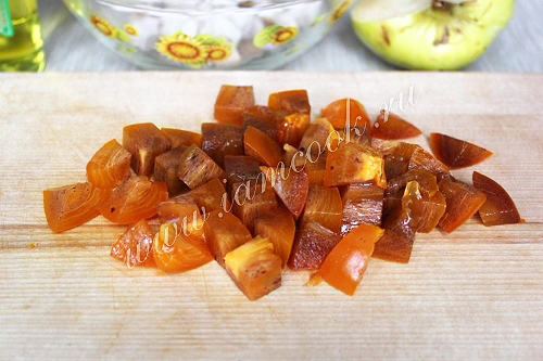Хурму оставьте с кожурой, если она точно не вяжет (надежнее, в этом плане сорт "королек") и нарежьте кубиками, убирая косточки.