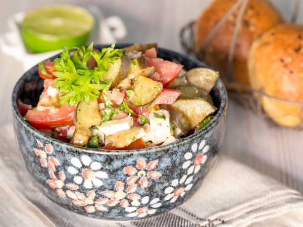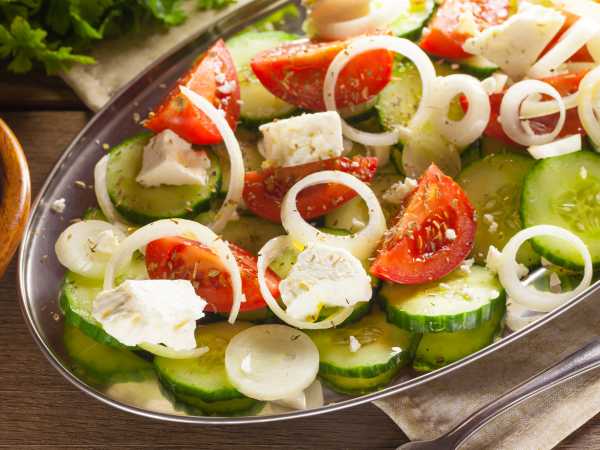 Нарежьте сыр фета на кусочки желаемого размера и толщины и добавьте его к овощам. Один из традиционных вариантов подачи салата предполагает, что порцию сыра не нарезают, а просто выкладывают на поверхность одним цельным кусочком.