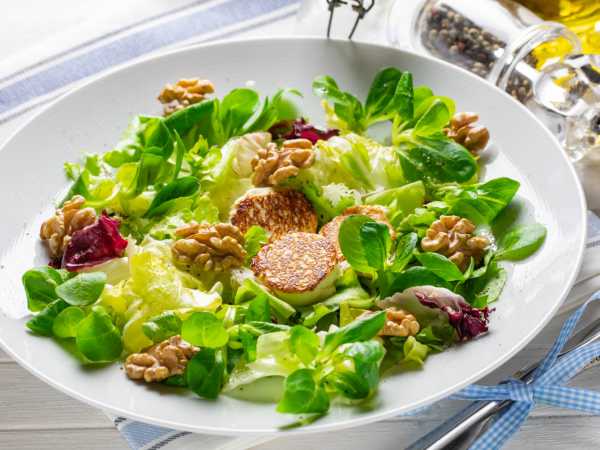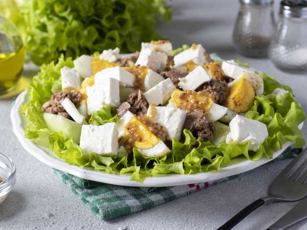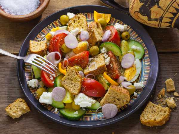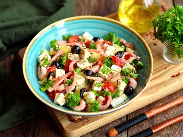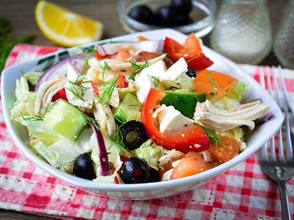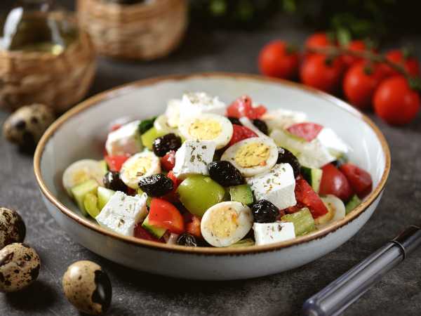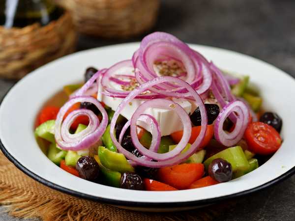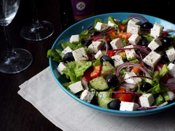 Наш греческий салат практически готов. Для подачи выстелите тарелку листьями салата. Добавьте подготовленную смесь овощей, а также оливки или маслины (на родине блюда чаще всего используют крупные оливки сорта «Каламата»).