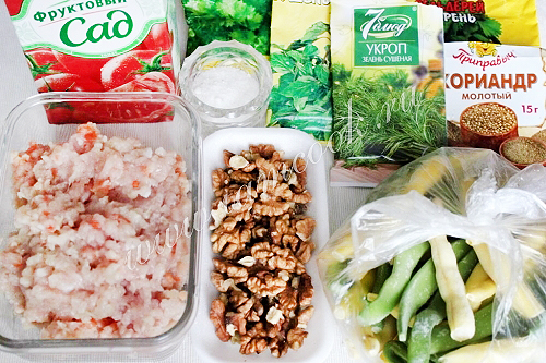 Предлагаю попробовать лобио из стручковой фасоли. Фасоль стручковая может использоваться как свежая, так и замороженная. Фарш лучше всего домашний. Я приготовила куриный: из грудок, лука, моркови и чеснока. А так, в принципе можно спользовать любой мясной фарш, но если не планируете добавлять овощи в сам фарш, то добавьте их в лобио. Томатный сок очень удобно использовать для тушения, как вариант, а ещё можно использовать свежие томаты или соединить томатный соус или томатную пасту с бульоном или водой.