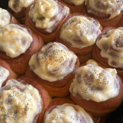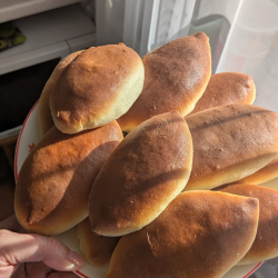 Муки ушло не 500 грамм, а грамм 600- 700...воду заменила на молоко. Тесто воздушное , сдобное. Разрезан сразу после духовки.