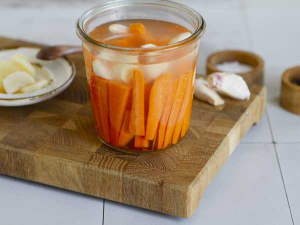 Для приготовления ферментированной моркови нам понадобятся: морковь, фильтрованная вода, соль и чеснок.