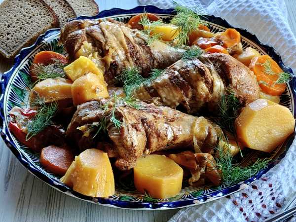 Соберите ингредиенты для приготовления картофельного рагу с курицей. Подойдут любые мясистые части птицы. У меня были голени.