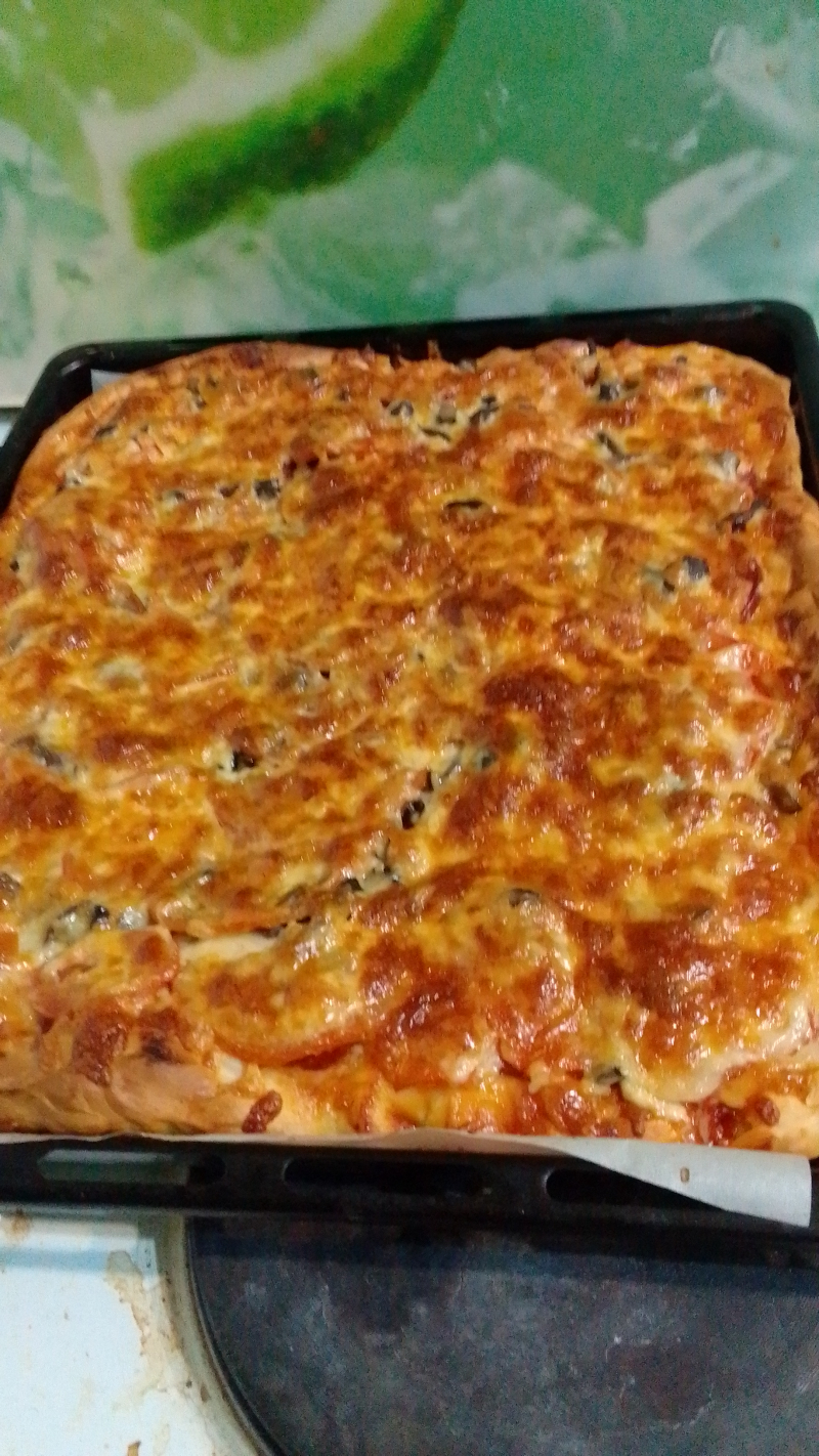 Приготовила пиццу по вашему рецепту, но не маленькую, а на целый лист. Грибочки - маринованные осенние опята. И много тёртого сыра сверху! Очень вкусно! Спасибо за рецепт!