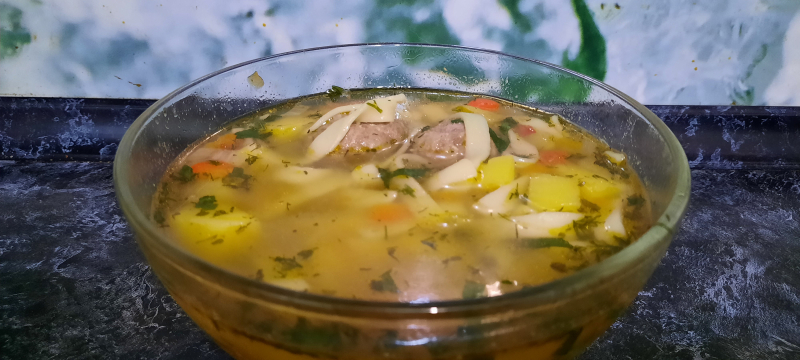 Приготовила суп по вашему рецепту. Только фрикадельки не куриные, а свиноговяжьи. И в обжарку добавила болгарского перчика. Получилось очень вкусно! Спасибо за рецепт!