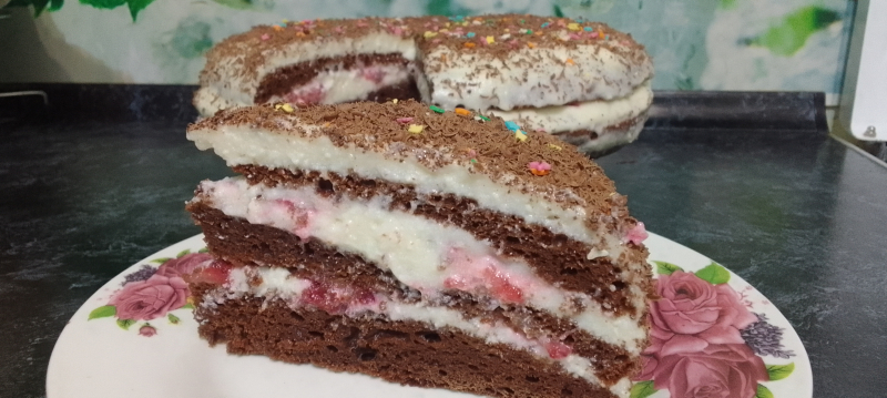 Испекла торт по вашему рецепту. У меня получилось разрезать даже на три коржа. В магазине не было замороженной вишни. Пришлось купить клубнику. Но всё равно очень вкусно! Спасибо за рецепт!