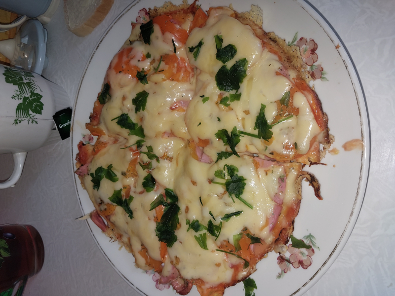 Мои измененияЯ добавила вместо лука, кавказские травы.Фотоотзыв #10523 по рецепту: Пицца за 10 минут на сковороде