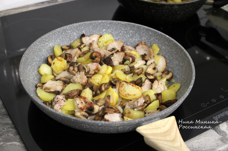 Вариант: вчерашний шашлык из свинины, шампиньоны, жареная молодая картошка, лук.