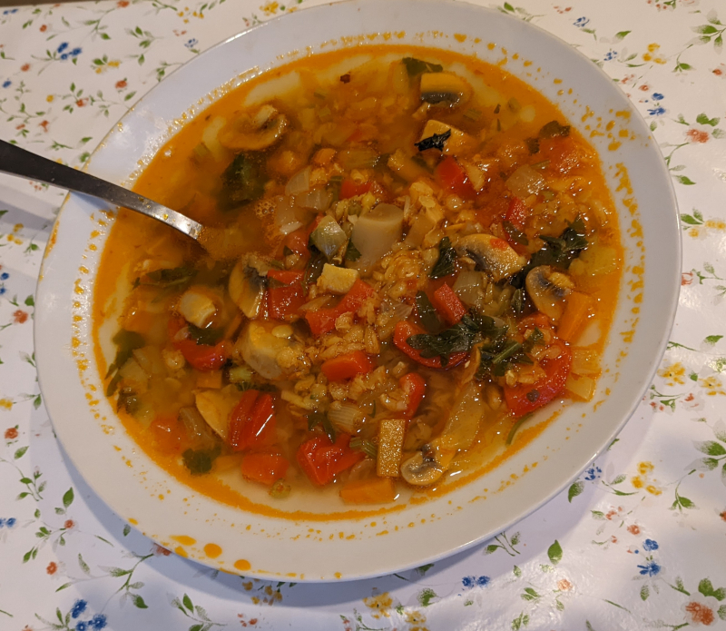 Дополнил овощами что были дома, для густоты: болгарский перец, грибы.Одной приправы - гарам масала-не было.