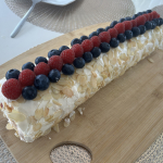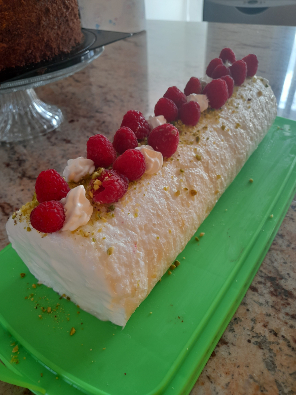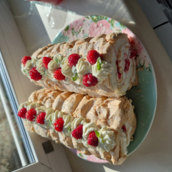 Меренга получилась мягкая, как суфле, пекла 20 мин. Единственное что изменю в следующий раз,это добавлю лимон или ванилин. Вкус яиц чувствовался. Малины много не бывает, можно и в два ряда выложить.Сверху посыпала измельчёнными фисташками, придало нотку вкуса. Фотоотзыв #12451 по рецепту: Меренговый рулет с малиной