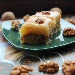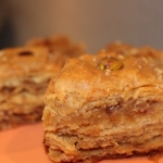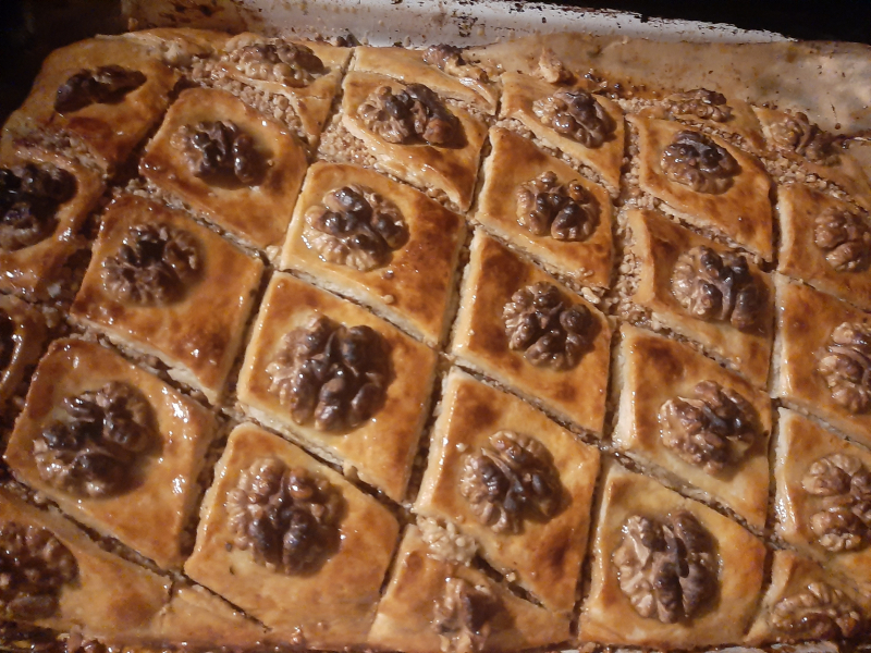 Пахлава отлично подходит для уютных вечеров с чашкой чая или кофе. 📋 **Ингредиенты:** Для теста: - Мука – 500 г - Яйца – 3 шт. - Сметана – 200 г - Сливочное масло – 150 г - Сахар – 150 г - Разрыхлитель – 1 ч. л. - Ванилин – щепотка Для начинки: - Кедровые орехи – 200 г - Мед – 200 г - Масло сливочное – 100 г **Приготовление:** 1. **Тесто:** - Смешайте муку, разрыхлитель и ванилин. - Взбейте яйца с сахаром до пышной массы. - Добавьте сметану и размягченное сливочное масло, перемешайте. - Постепенно всыпайте муку, замешивая тесто. - Разделите тесто на 6 частей и раскатайте каждую в тонкий пласт. 2. **Начинка:** - Обжарьте кедровые орехи на сухой сковороде до золотистого цвета. - Смешайте мед с растопленным сливочным маслом. 3. **Сборка:** - Смажьте противень сливочным маслом. - Выложите первый пласт теста, смажьте его медовой смесью. - Повторите слои: тесто, начинка, тесто и так далее. - Верхний слой смажьте оставшейся медовой смесью и нарежьте на ромбы. - Выпекайте в разогретой до 180°C духовке 30-40 минут до золотистой корочки. 4. **Подача:** - Готовую пахлаву достаньте из духовки и дайте остыть. - Нарежьте на ромбы и подавайте к столу. Фотоотзыв #12546 по рецепту: Пахлава азербайджанская