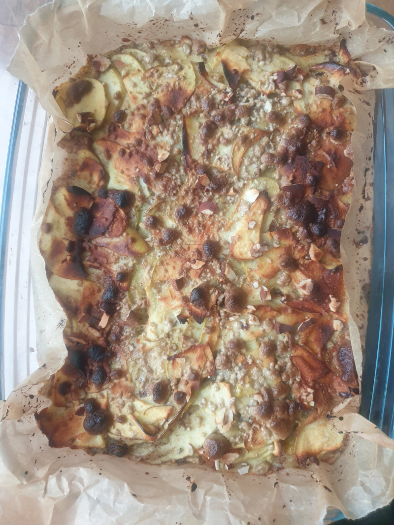 Делал без заливки, сахара 30г и немного изюма. Сверху пару порубленных орехов. Тесто очень жидкое, но пропеклось хорошо. Кожуру с яблок не снимал. Последние 5 минут положил сверху немного халвы (эксперимент). Она вполне ожидаемо пригорела.