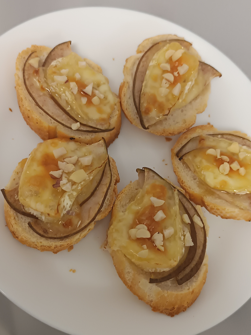 Делала на пробу блюда из меню на Новый год. Делала с кешью и арахисом. Делала без оливкового масла. Просто багет, груша, сыр. Запекла. Полила медом и сверху дробленный орех. Мне не хватило чего-то между хлебом и грушей. Может именно первоначального обжаривания багета с олив маслом, а уже потом запекания. Из орехов все таки фисташки выберу