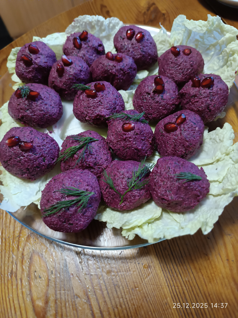Приготовила пхали- всем понравились эти свекольные колобки. Добавила немного аджики для перчинки. Соку слилось почти 1,5 стакана ( делала сразу двойную порцию), как раз для окрашивания клубничек из картофеля.