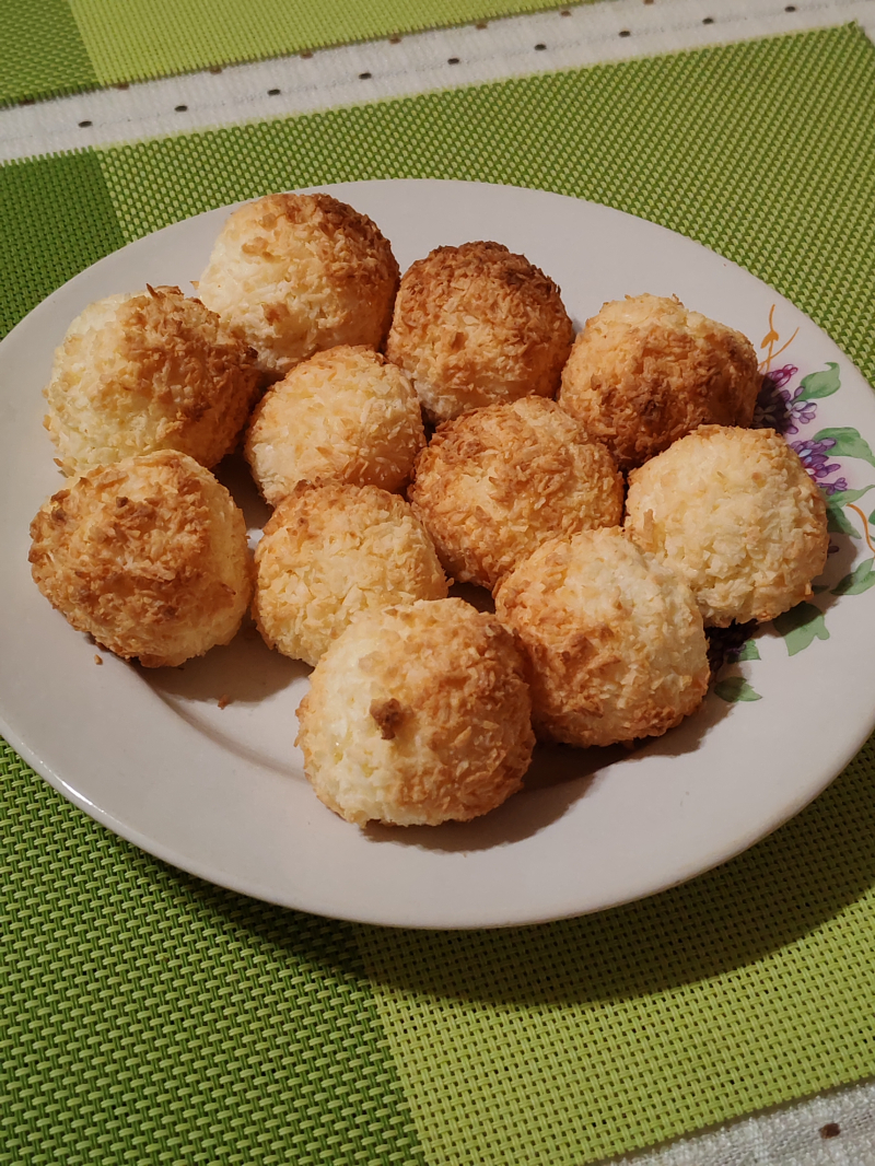 Мои измененияВ пропорции увеличила количество кокосовой стружки, и сделала без крахмала. 2 яйца + 100 г сахара + 200 г кокосовой стружки (премиум качества, не жмых, а именно стружка).Фотоотзыв #13861 по рецепту: Печенье «Кокосанка»