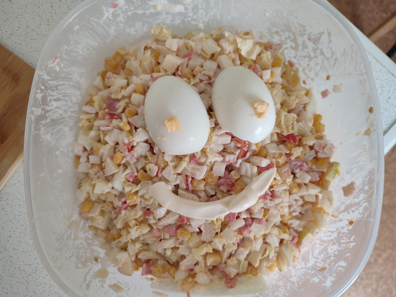 Готовили с ребятами, потому вышел весёлый салат, который всем понравился ☀️