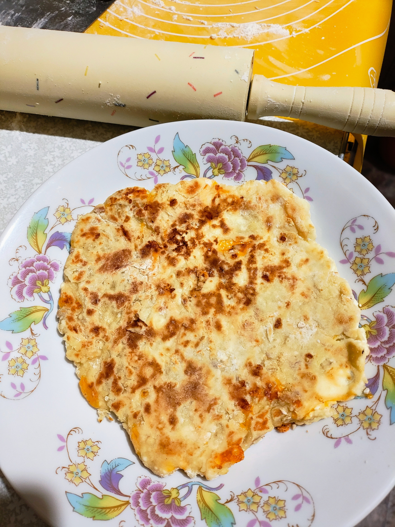 Сахар не добавляла, жарила на сухой сковороде. Думаю вкуснее будет, если сильно в блин не раскатывать