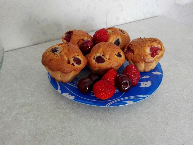 Приготовила маффины не только с клубникой, но и с черешней. Получилось очень вкусно! Время приготовления увеличила до 1 часа.