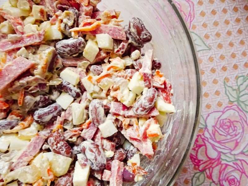 Салат с копчёной колбасой и фасолью