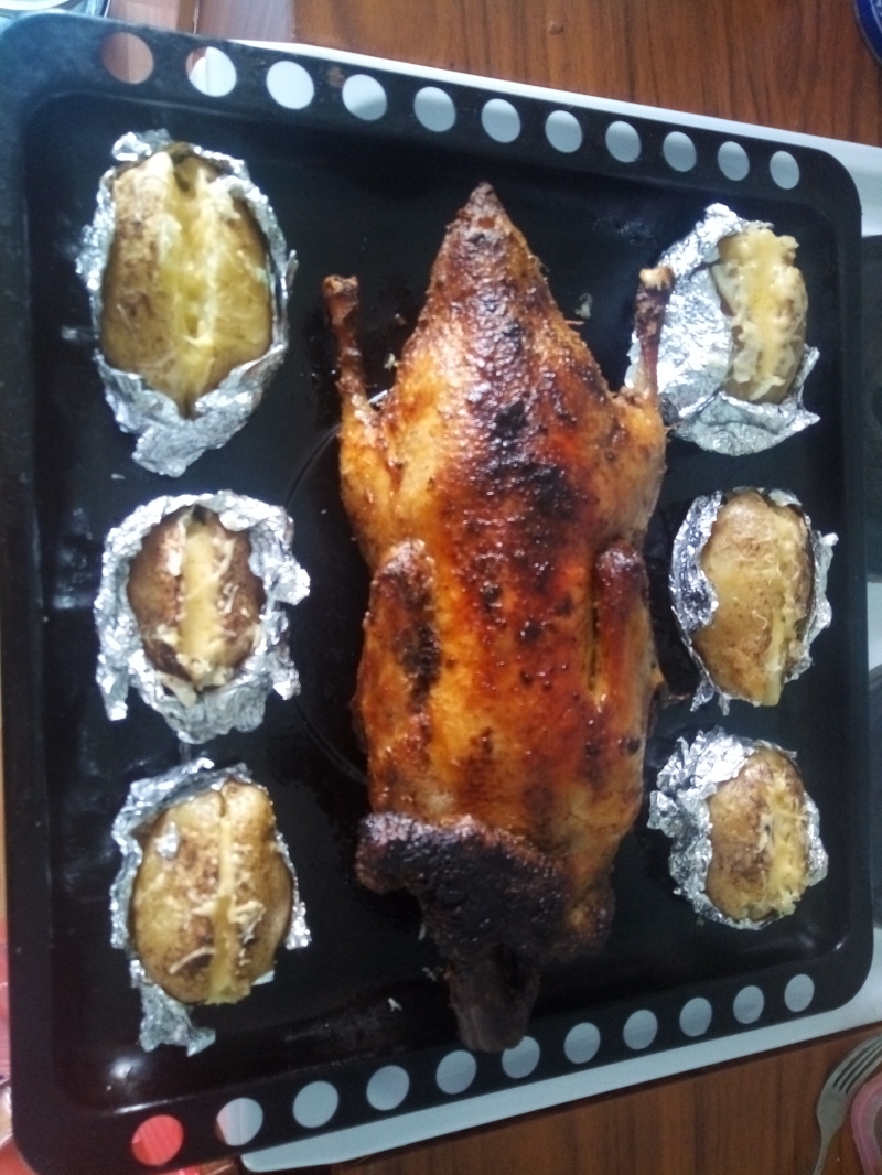 Ну вроде всё... Запеченая утка с яблоками и апельсином в винном соусе, с гарниром из печеного картофеля фаршированного чесноком и сыром...