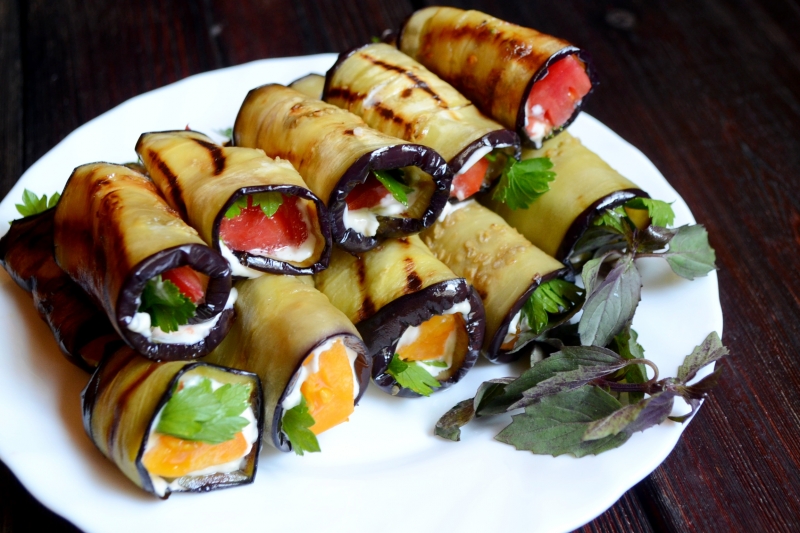 Это неимоверно просто и так же неимоверно вкусно. Серьезно. Сочетание сливочного сыра с острым чесночком, сочным помидором и мягким нейтральным баклажаном - беспроигрышный вариант для любого застолья. Такая закуска достойна даже праздничного стола. Помидоры я взяла красные и желтые, это украшает рулетики из баклажанов с помидорами и сыром фета, но на вкусе никак не отражается. Фету, если не нашли, замените брынзой или адыгейским сыром. Зелени тут тоже чем больше - тем лучше! Петрушка, базилик, укроп, даже можно рукколу засунуть - все подойдет отлично! Спасибо, автор