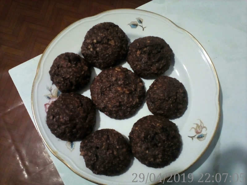 Очень хороший рецепт диетического печенья, но я люблю всё шоколадное, и Добавила какао и кусочки шоколада, а еще орехи. Получилось ароматное и красивое песенье в форме полусферы.