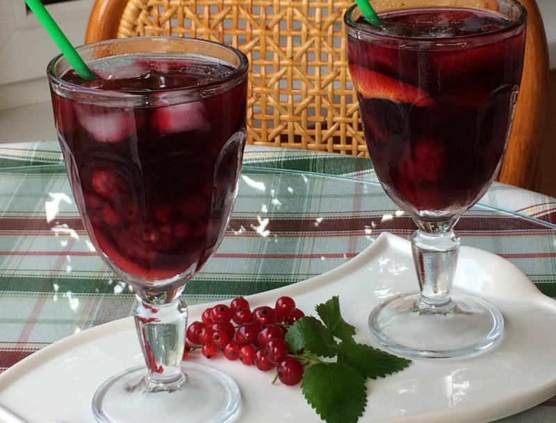 Делала на красном вине, поэтому цвет отличается. Заправляла домашними ягодами: клубникой, малиной, красной смородиной. Плюс лимон, специи, коричневый сахар, коньяк и газированная вода. В выходной день да в жару +35 в тени домашние очень даже оценили!