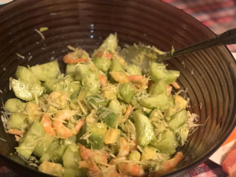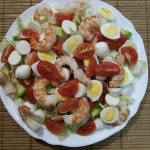 Сегодня приготовила этот овощной салат с креветками и авокадо. Вкус свежести ,который ему придают огурчики и лимонный сок , а так же ореховый вкус авокадо в сочетании с креветками ,делают его достаточно пикантным и изысканным .Единственное,что я не добавила яйца , по скольку просто их не люблю ) но не думаю ,что салат проиграл из за этого во вкусе . Рекомендую попробовать )
