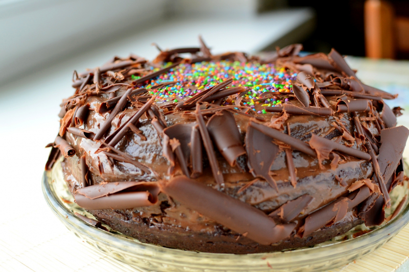 Торт "Шоколадный шифон" я видела в сети давненько, но приготовить решилась именно по этому рецепту. Получился просто красавец. Добавила в торт, правда, 6 яиц (и белков, и желтков), ну и украсила по своему вкусу -шоколадной стружкой и разноцветной кондитерской присыпкой для куличей. Рецепт действительно отличный, бисквит нежный и насыщенно шоколадный.