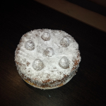 Торт на сковороде со сгущенкой у меня получается квадратный, по форме моей сковороды. У меня был отварной нут, я смешала его с какао, сделала декор из кондитерского шприца.