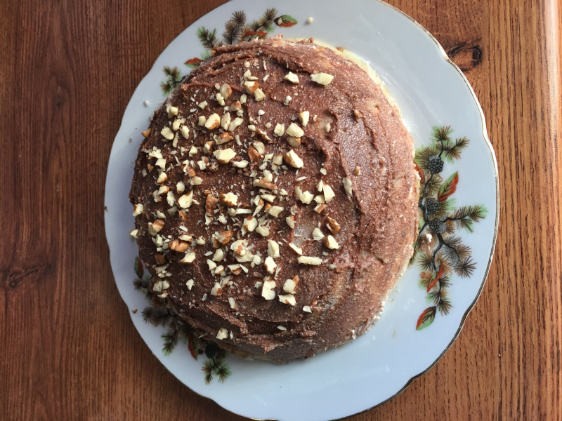 Вкусный тортик, всем понравился! Спасибо за рецепт! Сверху был покрыт шоколадной пастой и орешками.