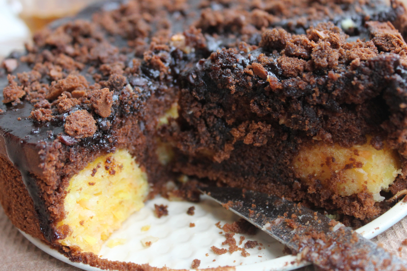 Спасибо за идею, пирог получился непревзойденный! Правда, я внесла свои коррективы в рецепт. Например, не шоколад в тесто, а какао применила. Положила не разрыхлитель, а соду. Мне показалось, что муки для такого количества яиц явно маловато, поэтому добавила еще немного, чтобы получилось плотное, но текучее тесто. Сахара вдвое больше положила, а крахмала вообще не клала (он для творога хорош). В моем рецепте также есть сметана и масло сливочное. Немного по-другому приготовила и творожные шарики. Так, в творог добавила не желтки, а яйца, взбитые с сахаром. Крахмала взяла не 3, а одну столовую ложку. Кроме того, добавила половинку яйца. Старалась достичь консистенции, которая бы позволила без труда слепить шарики. Кстати, советую отправить их в морозилку. Через 30 минут они легко выравниваются! Выпекала пирог час. В конце залила его шоколадной глазурью. Получилось шикарно! Фотоотзыв #6497 по рецепту: Шоколадный пирог с творожными шариками