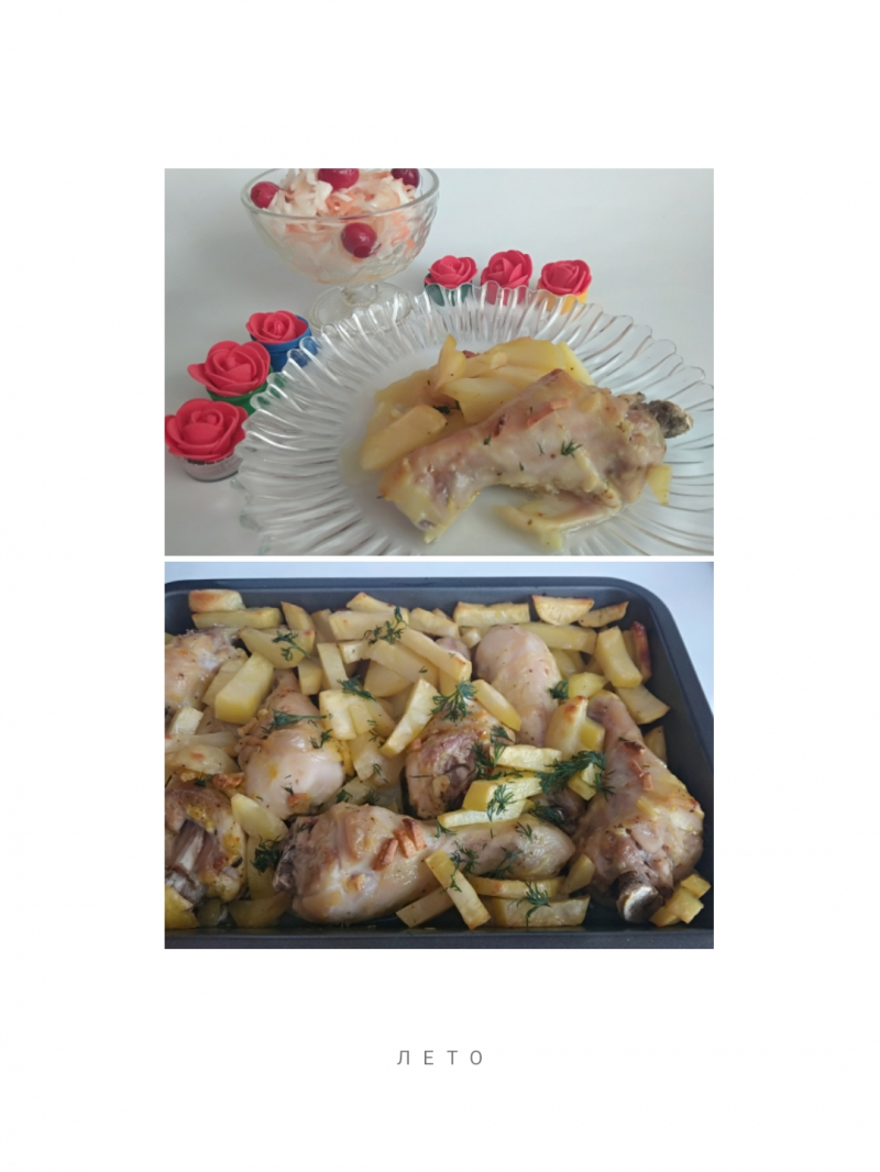 Готовила один в один и всё получилось вкусно. Только заменила бедрышки куриные на голени. Немного маринованной домашней капусты к картошке - мой индивидуальный вкус. Ну, не могу я есть картошку без солененького.