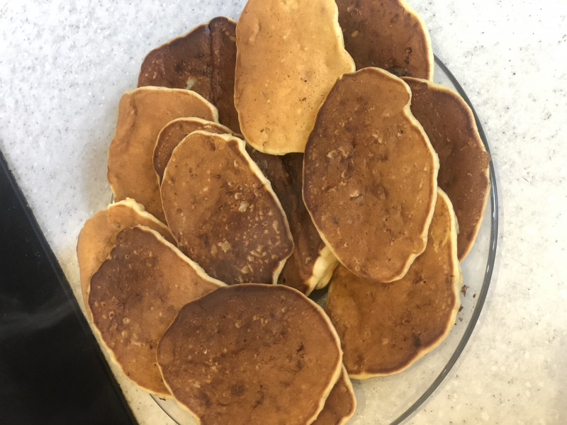 Сегодня приготовила яблочные панкейки, добавила правда ещё половину банана. Для усиления вкуса щепотку корицы, а вместо сахара мёд. Муки совсем по минимуму. Панкейки вышли очень нежными и с тонким привкусом банана с корицей. Тут главное не переборщить.